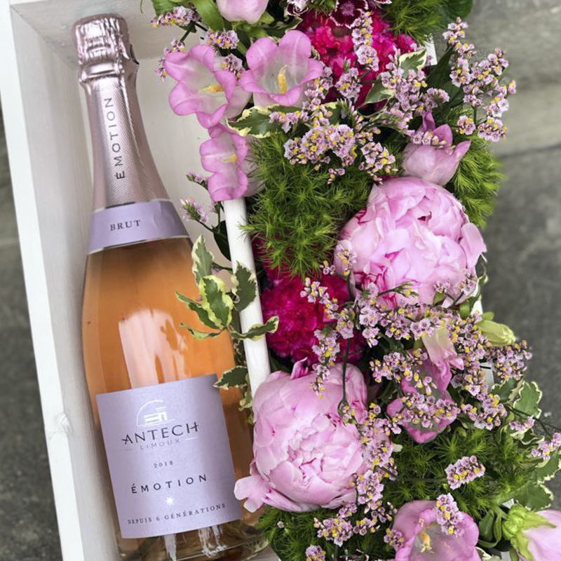 Voici un coffret avec sa composition florale dans les tons pastels, création originale Murielle Bailet®. Ce travail vient s'associer à une bouteille de la célèbre Maison Antech de Limoux. Fruit du mariage des cépages Mauzac, Chardonnay, Chenin et Pinot noir,elle offre une robe rosée aux reflets toniques : idéal pour accompagner apéritifs et desserts.