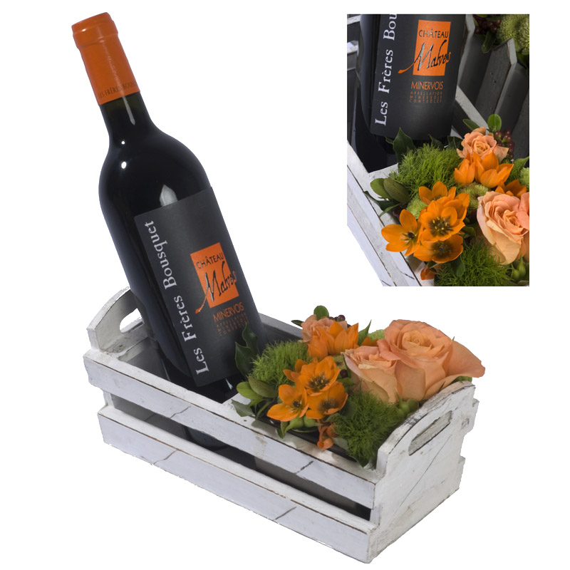 Murielle Bailet® Un travail réalisé dans une caissette en bois naturel comprenant une composition florale travaillée dans un bac en métal, évoquant par ses couleurs la bouteille de vin qui l'accompagne (Minervois rouge tradition des frères Bousquet*). Ce produit vous est proposé en association avec le château Malves-Bousquet en Minervois.
